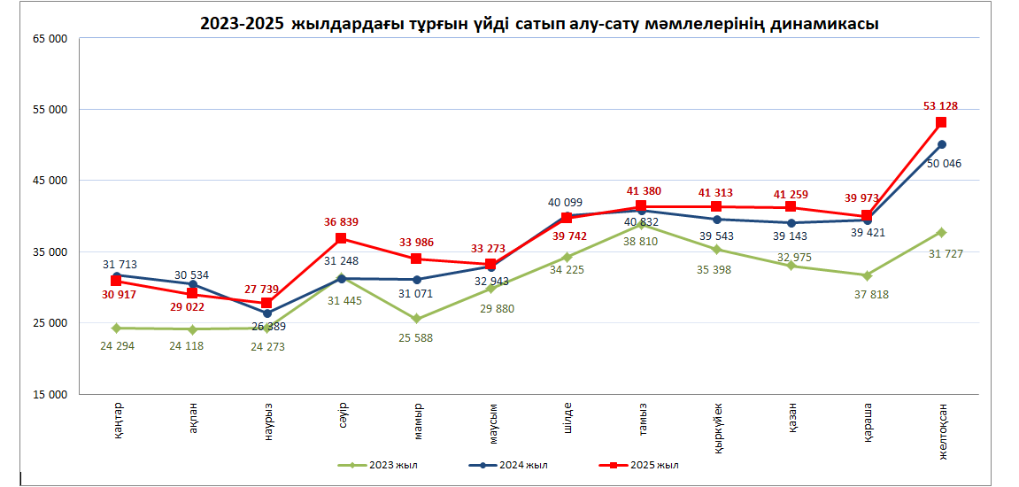 2025 жылғы желтоқсан айында тұрғын үйді алып-сату бойынша, Ұлттық статистика бюросынан білгеніміздей, соңғы үш жылдағы ең жоғары көрсеткіш тіркелді – 53 128 мәміле, бір айдағы мәміле саны 32,9% өскен. Қараша айымен салыстырғанда желтоқсанда мәмілелер санының өсімі еліміздің барлық өңірінде байқалды. Ең жоғары өсім Маңғыстау (+69,2%), Павлодар (+66,3%) және Ақтөбе (+53,6%) облыстарында.