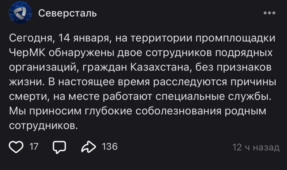 Как сообщили в пресс-службе компании, трагедия произошла 14 января. На промплощадке ЧерМК без признаков жизни были найдены двое сотрудников подрядных организаций, являвшихся гражданами Казахстана.