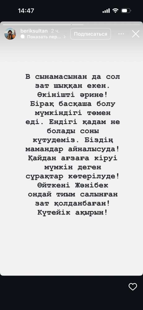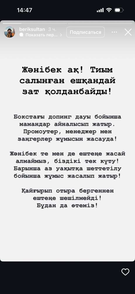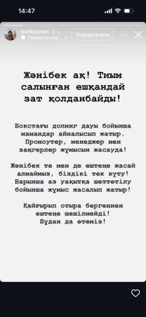 «Жанибек чист. Он никогда не использовал никаких запрещенных веществ», — подчеркнул менеджер, отметив, что в настоящее время ситуацией занимаются специалисты.